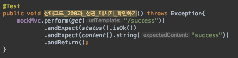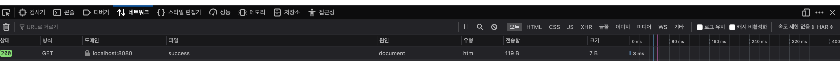 정상적으로 OK 상태코드와, "success" 메시지를 응답받는 것을 확인할 수 있다. 실제로 서버를 기동시키고 웹 페이지에서 /success 경로에 진입해본 뒤 관리자 모드(f12) > 네트워크 > 모두 보기를 들어가면 아래와 같이 메시지와 상태코드를 확인할 수 있다.