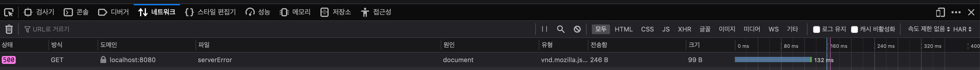 해당 url을 웹페이지에서 직접 들어가보면 성공 응답을 내렸던 것과는 다른 화면이 보인다. Json 형식이기 때문에고, 네트워크 탭을 보면 역시 500 에러를 확인할 수 있다.