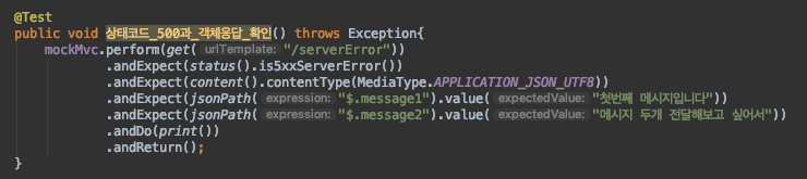 이 API는 JSON 객체를 응답하기 때문에 검증 시 jsonPath를 이용하였다. "$.message1"은 message1 필드를 뜻한다.