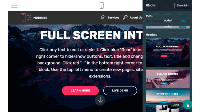 모바일라이즈는 모바일을 우선시하며 간편한 드래그 앤 드롭 인터페이스를 채택하고 있습니다. 이 웹 빌더는 오프라인 웹사이트 빌더 중에서는 가장 유명합니다. 모바일라이즈는 윈도우와 맥 환경에서 다운받을 수 있으며, 여기에는 2만 개가 넘는 고해상도 이미지와 6천 개 이상의 아이콘들은 물론이고, 1800개 이상의 웹사이트 블록들이 포함되어 있습니다.