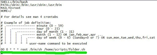 00 0 * * * root /bin/sh /home/scripts/folder.sh