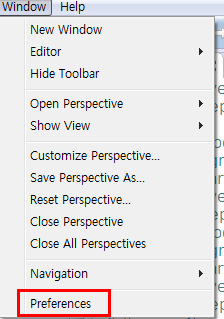 먼저 이클립스의 Window - Preferences 에 들어옵니다.