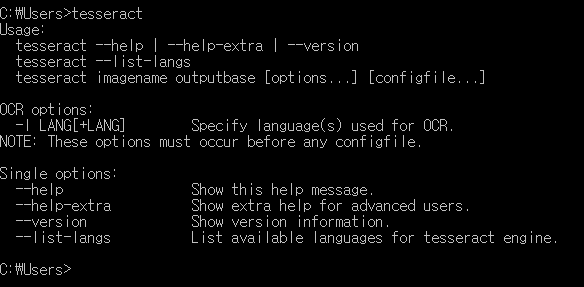 환경변수를 등록하였으면 cmd 창을 열러 tesseract 입력하여 확인을 해본다.