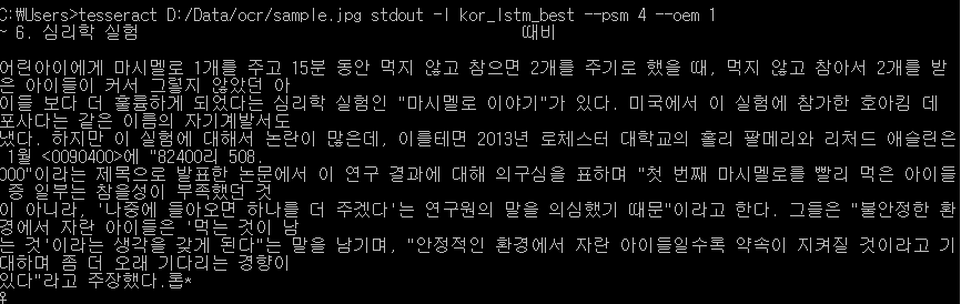 C:\Users>tesseract D:/Data/ocr/sample.jpg stdout -l kor_lstm_best --psm 4 --oem 1