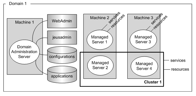 관련 있는 서버들의 그룹으로 기본 관리 단위이다. 하나의 도메인은 비즈니스에 따라 여러 개의 서버와 클러스터로 구성된다.