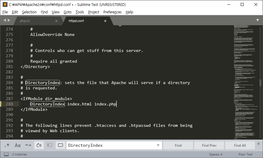 이제 apache설정을 다시 수정해야한다. C:/APM/Apache24/conf의 httpd.conf를 열고 다음과 같이 수정한다.