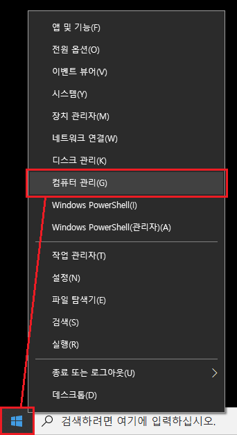 등록된 여부를 확인하려면 Windows10의 "서비스"화면에서 확인할 수 있다. 바탕 화면 왼쪽 하단의 시작 메뉴를 마우스 오른쪽 버튼을 클릭하여 표시되는 메뉴 중에서 "컴퓨터 관리"를 클릭한다.