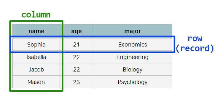 테이블의 열에 해당하는 칼럼은 각기 구분하기 쉽게 이름을 붙여 분류한다. (ex. name, age, major 등) 또, 각 칼럼은 특정한 데이터 타입을 가진다. (ex. age의 데이터 타입은 INTEGER)