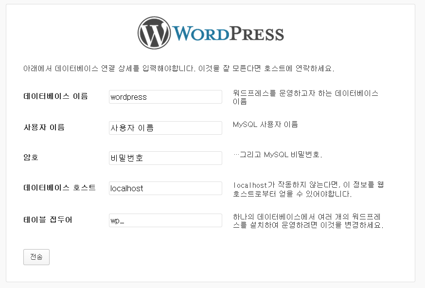 양식에 맞게 자신의 데이터베이스 이름 및 MySQL 정보를 입력한다.