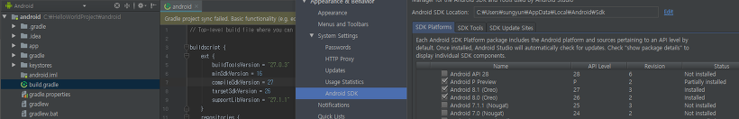 build.gradle 를 열어, 위 캡쳐와 같이 현재 프로젝트의 targetSdkVersion = 26 으로 SDK Manager 의 API Level 이 같은것을 확인하고,