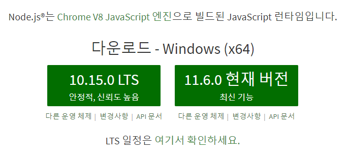 https://nodejs.org/ko 로 이동하여 설치파일을 다운받고 설치 합니다.